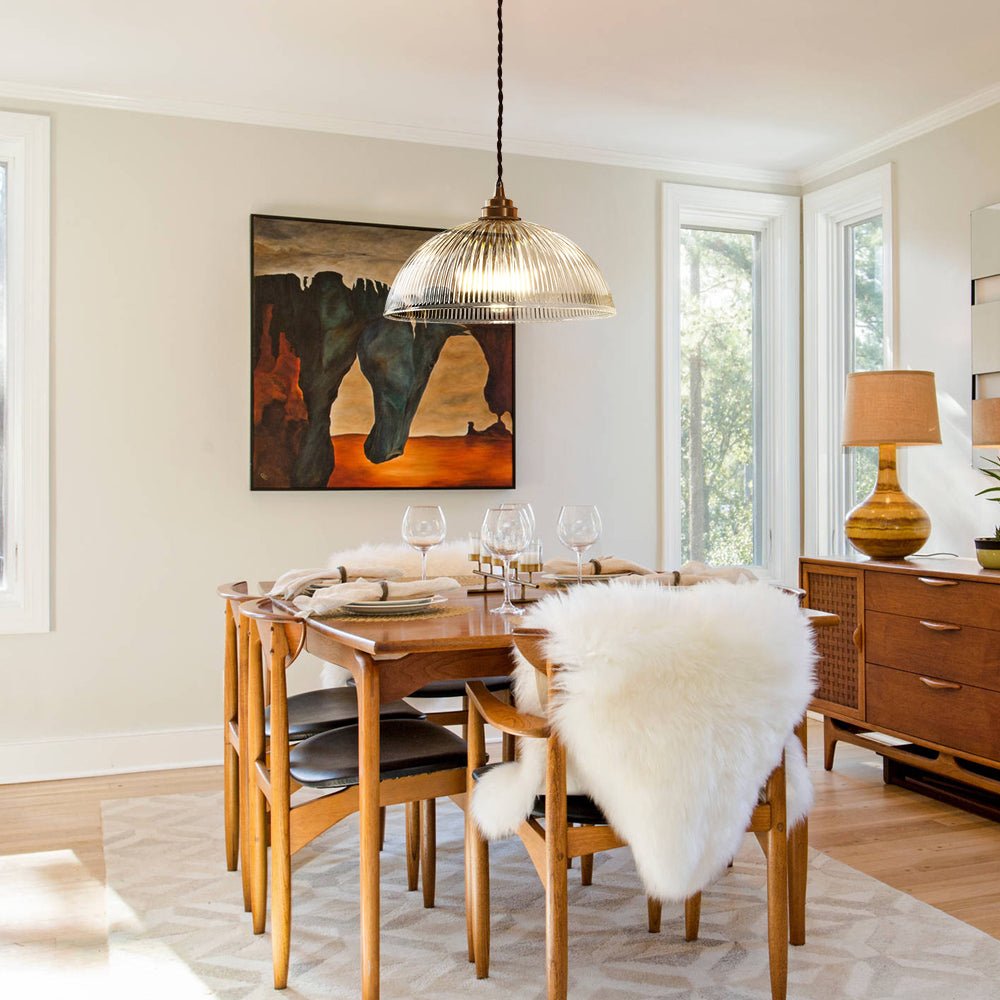 This pendant light pairs practical illumination with a refined decorative touch, making it a versatile addition to many spaces. Its dome-shaped shade offers a timeless silhouette, helping spread light softly and evenly throughout the room. What truly sets this fixture apart is its clear, ribbed glass. The vertical grooves introduce subtle texture and catch the light in a captivating way—casting delicate patterns that enrich the atmosphere when the pendant is switched on. Because the glass is fully transparent, it brightens the room generously while still creating a warm, inviting glow.