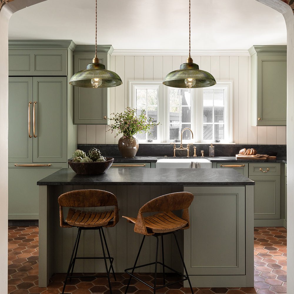 Modern Industrial • Dome Pendant • Brass Finish • Adjustable Height • Clear/ Green Glass