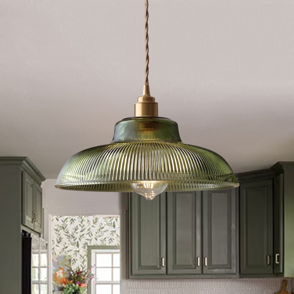 Rooted in classic industrial design and softened with subtle farmhouse influences, this ribbed glass pendant delivers a clean yet expressive look. Its broad dome silhouette is carefully formed to provide even, well-balanced illumination, casting light gently throughout the space. The clear, vertically fluted glass shade adds depth and visual interest, catching and dispersing light in a refined, architectural pattern when illuminated. Bright yet welcoming, the transparent glass enhances clarity without sacrificing warmth. Designed for those who value thoughtful craftsmanship, this dome pendant serves as both a functional light source and a tasteful design accent that enriches any interior.