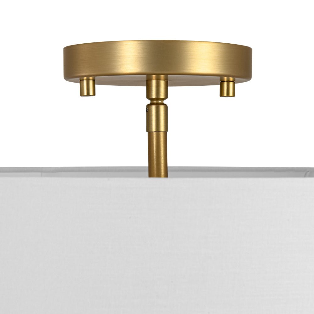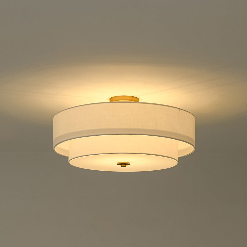 Blending clean design with subtle warmth, this Mid-Century Modern semi-flush ceiling light offers a stylish yet versatile lighting solution for contemporary homes. Its wide drum silhouette is wrapped in a crisp white linen shade and paired with a frosted acrylic diffuser, creating a soft, evenly distributed glow. Brushed brass accents add a refined touch, elevating the overall look with understated elegance. A two-tier configuration introduces visual depth while maintaining the fixture’s minimalist character. Designed to accommodate four E27 medium-base bulbs (not included), the linen shade and diffuser work together to provide comfortable ambient lighting that is both functional and inviting. With its balanced proportions and timeless appeal, this ceiling light is a great fit for living rooms, dining spaces, bedrooms, kitchens, entryways, or foyers.