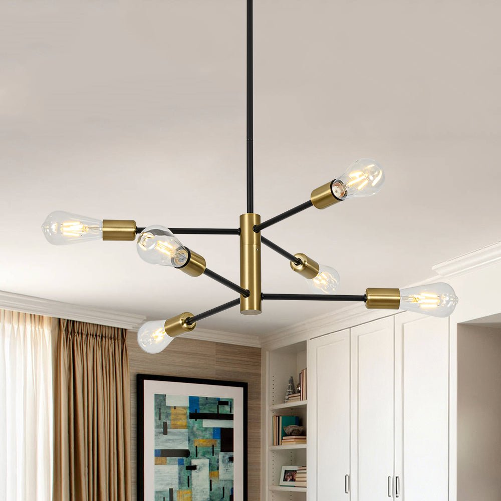 This six-light chandelier showcases a sleek sputnik-inspired silhouette that brings a contemporary edge to any space. Suspended from a round ceiling canopy, the fixture extends into six streamlined, pipe-style arms, each supporting an exposed bulb at both ends for a bold, modern statement. Designed to accommodate bulbs up to 40W (not included), it is also compatible with dimmer switches (not included), allowing you to easily adjust the lighting to suit your mood and setting.