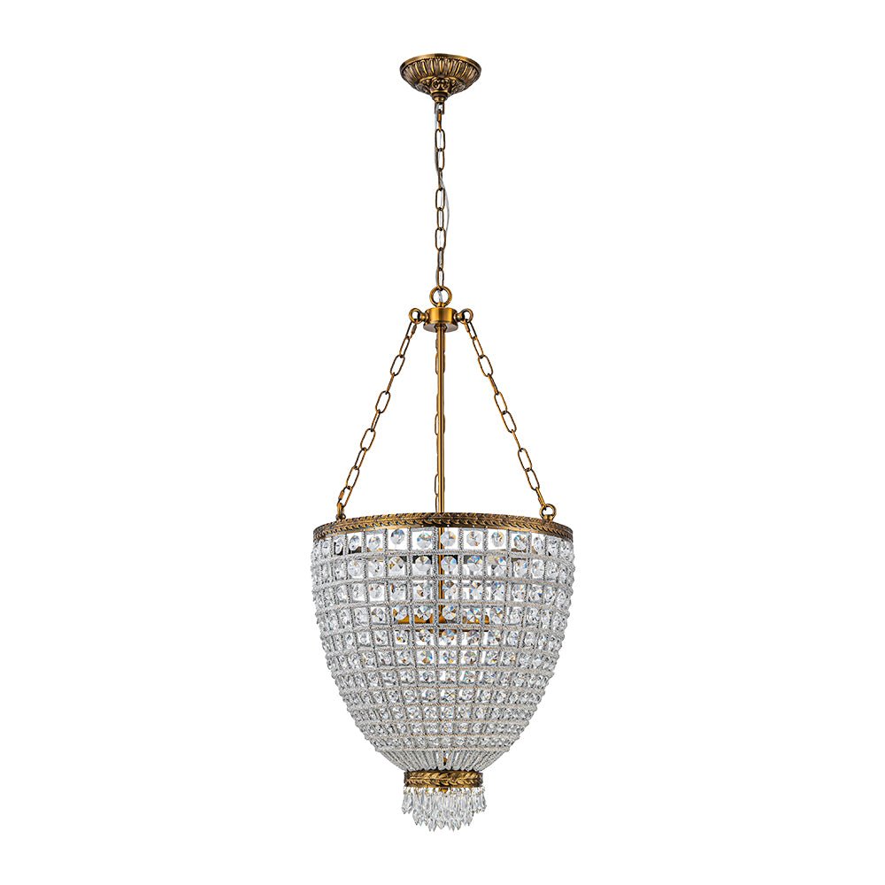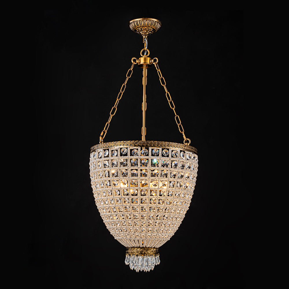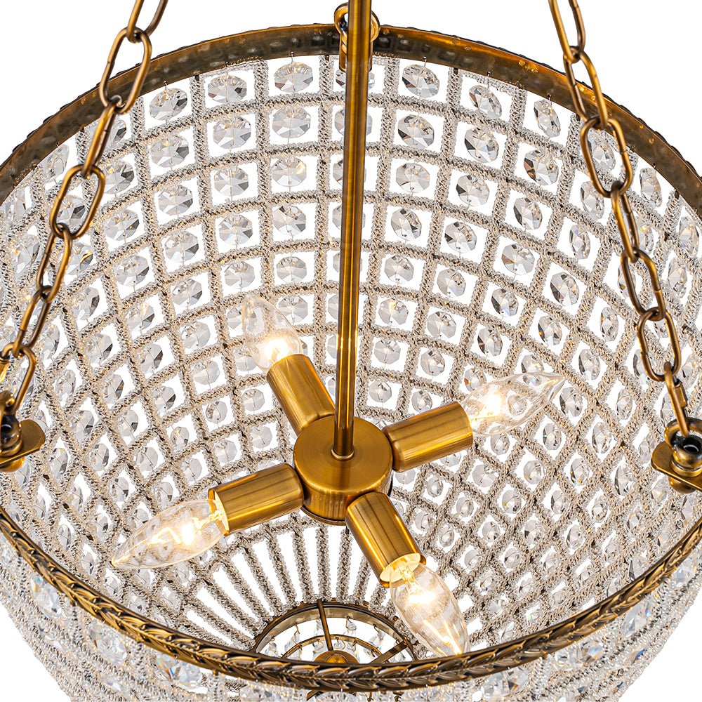 Glamourös und modern • Metall- und Kristalldesign • 4-flammig • Antikmessing-Finish • Dimmbarer Korb-Kronleuchter • CE-gelistet