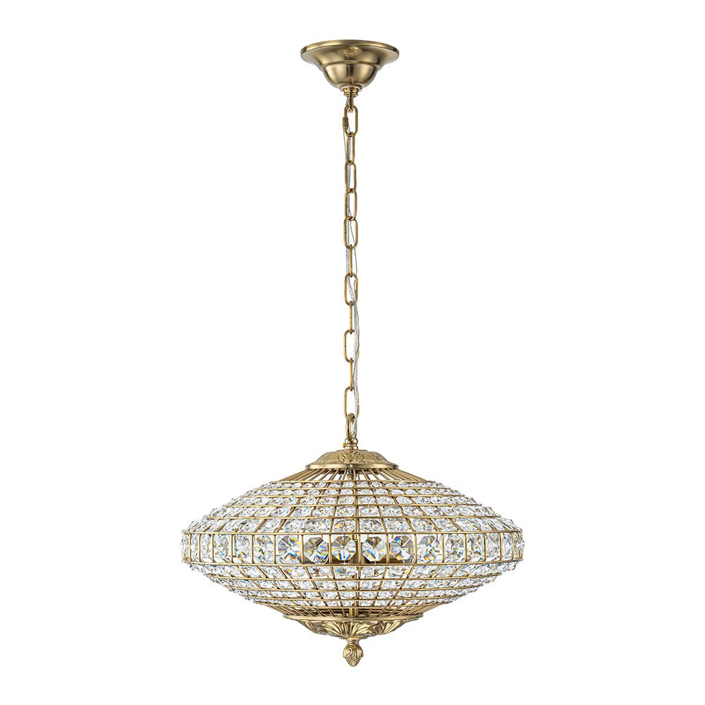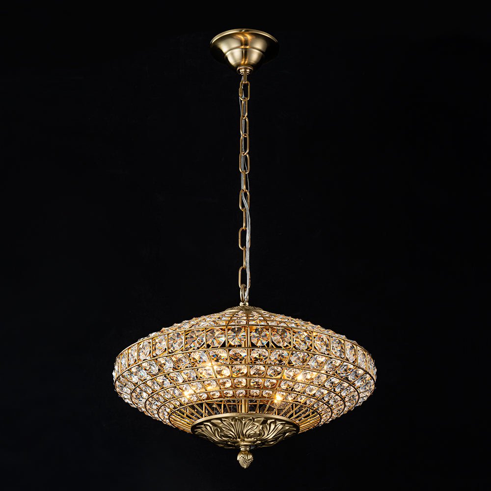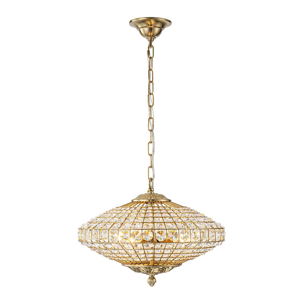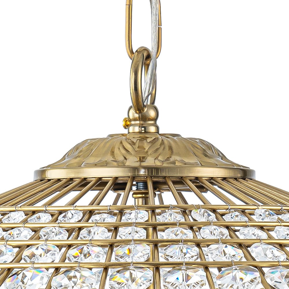 Antiker Kronleuchter aus Messing mit Kristall in Rautenform