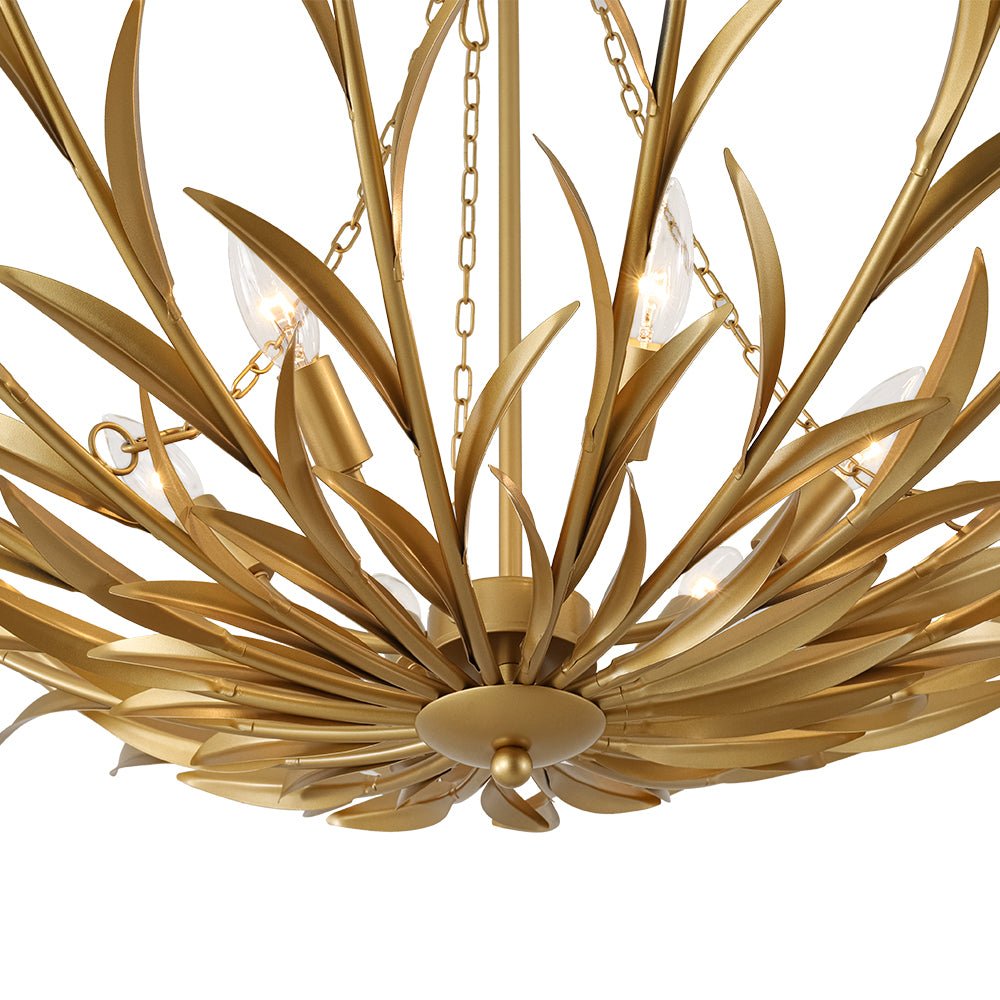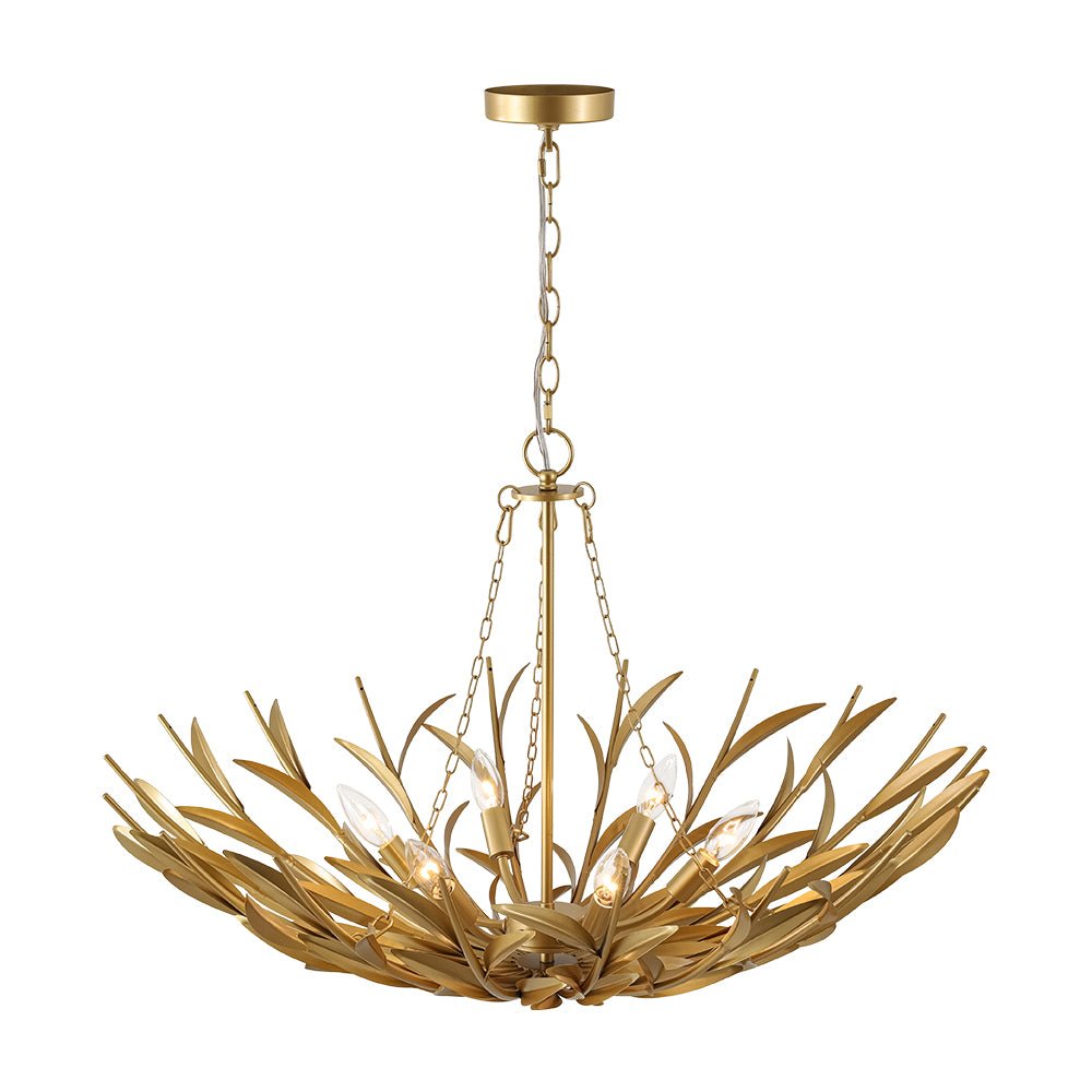 Anmutig gegossene Schilfrohre bilden einen korbartigen Rahmen für diesen sechsflammigen Kronleuchter, der natürliche Inspiration mit zeitlosem Design verbindet. An Ketten aufgehängt und an einem zentralen Pfosten verankert, schwingt die Leuchte mit Leichtigkeit von der Decke herab. Der moderne Messing-Beckenleuchter vereint organische Details mit einem Hauch zeitgenössischer Eleganz.