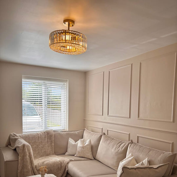 Werten Sie Ihren Raum mit dieser exquisiten halbbündigen Fassung aus geschnitztem Kristall auf, bei der zeitgenössisches Design auf zeitlosen Luxus trifft. Mit einem modernen, mit schimmernden Kristallen verzierten Trommelschirm verwandelt diese Leuchte Umgebungslicht in ein elegantes Statement. Mit vier Lichtern sorgt sie für reichlich Beleuchtung und verleiht jedem Raum eine raffinierte Note. Ihr auffälliges Design verbessert die Ästhetik Ihres Zuhauses und schafft einen raffinierten Blickfang. Dieses Stück eignet sich perfekt für Schlafzimmer, Eingangsbereiche, Küchenzeilen, Flure, Treppenhäuser und mehr und verleiht jedem Raum einen Hauch von urbaner Romantik und klassischem Charme.