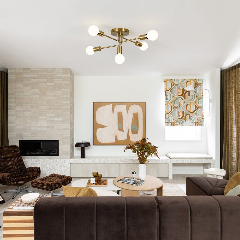 Bring a touch of artistic elegance to your home with this five-light swirl sputnik ceiling fixture in a warm brass finish. Designed with gracefully curved arms radiating from a central base, it creates a striking focal point on your ceiling while enhancing the ambiance of bathrooms, bedrooms, and living spaces. The polished brass surface reflects light beautifully, adding depth and warmth to modern interiors. Perfect for living rooms, hallways, dining areas, and more, this fixture delivers both style and inviting illumination.